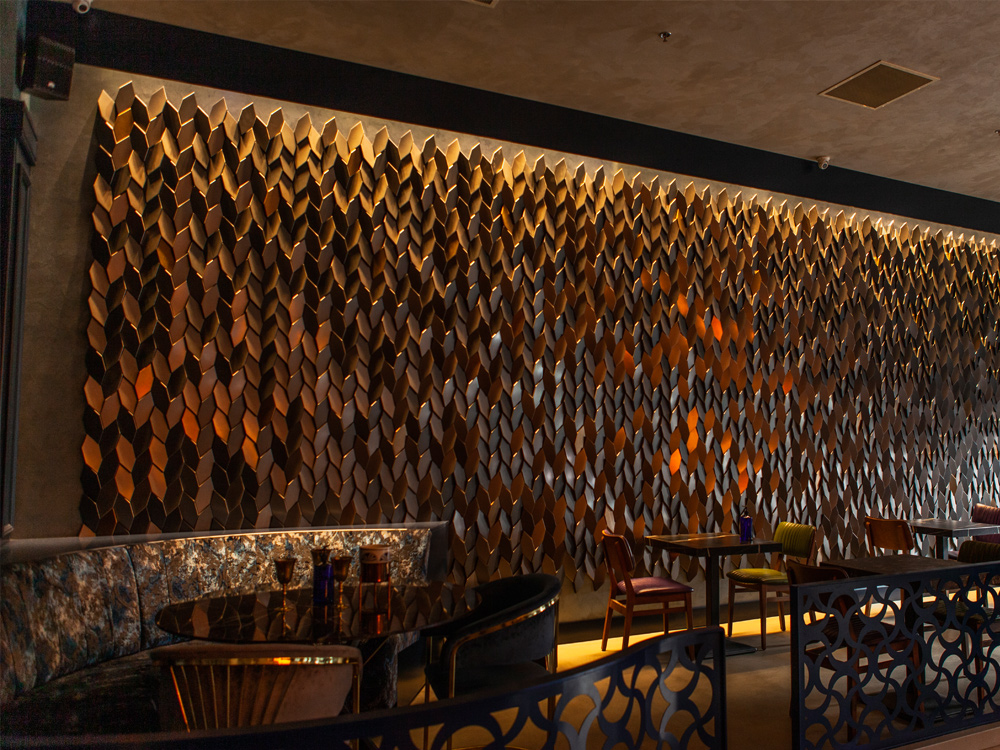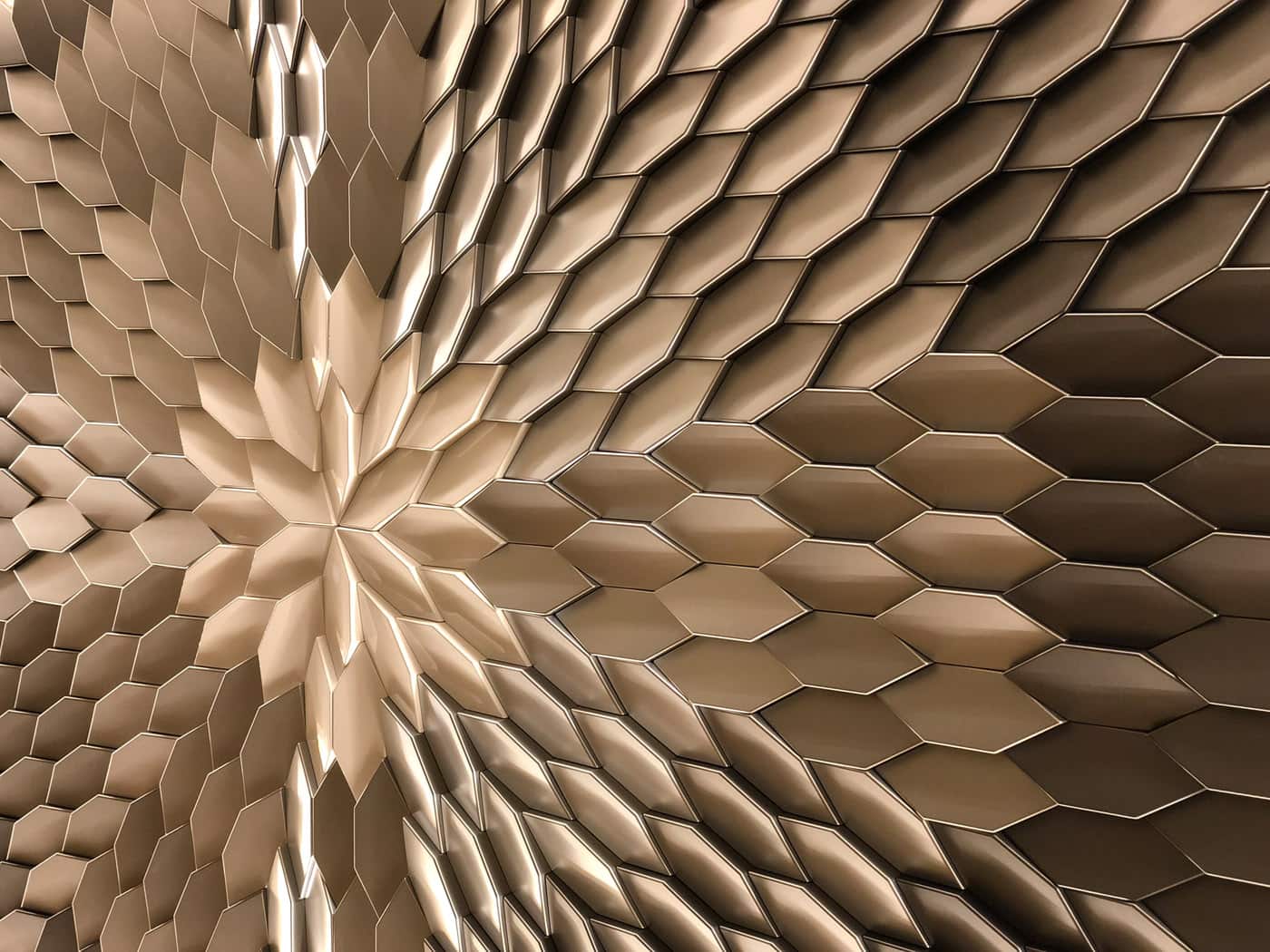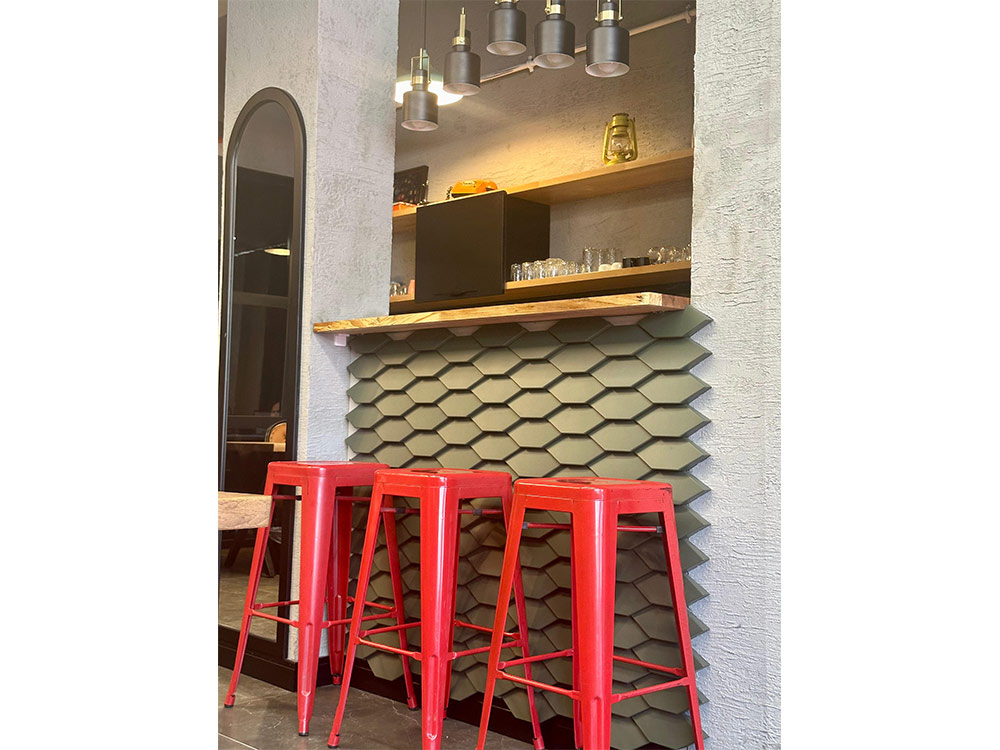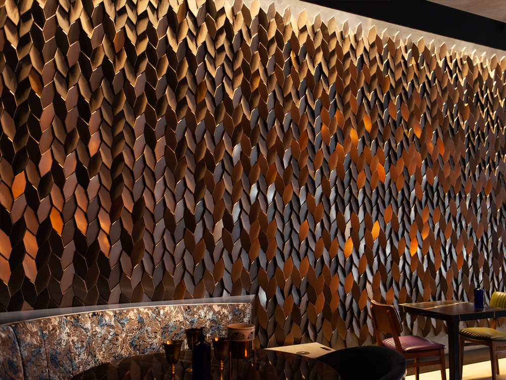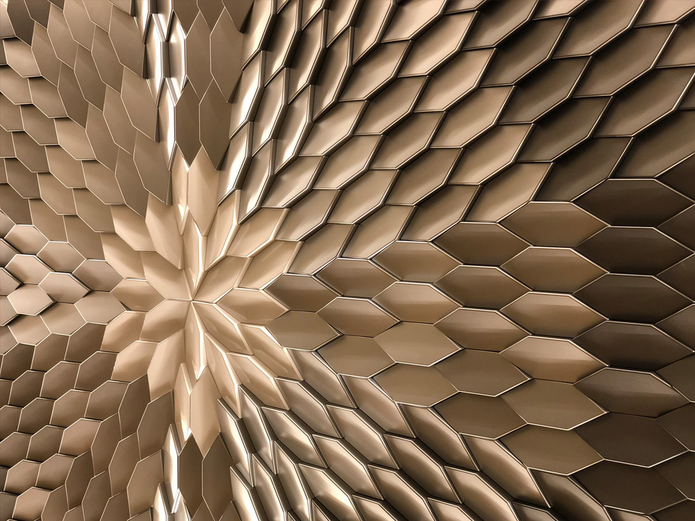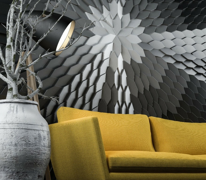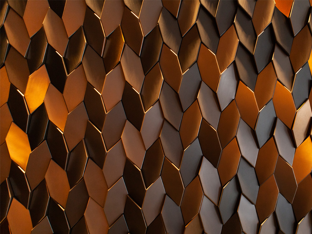 Tieto malé polygonálne dlaždice v protichodných smeroch vytvárajú jemné geometrické pruhy. Dizajn dlaždíc dodáva stene pocit hĺbky vďaka hre svetla a tieňov, ktoré vytvára polygonálna geometria Mabel. Tento experimentálny dizajnový prístup založený na povrchu sa dá využiť v širokej škále kontextov a aplikácií v oblasti nástenných dekorácií. Tvar dlaždíc vytvára ilúziu farebných odtieňov prostredníctvom prirodzeného odrazu svetla.