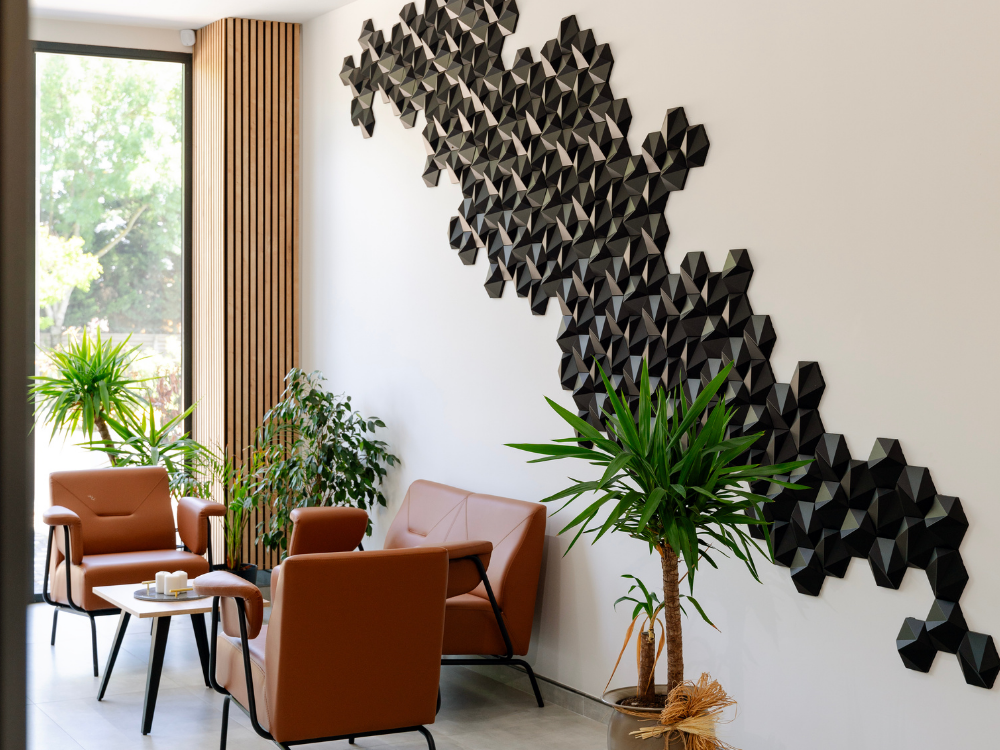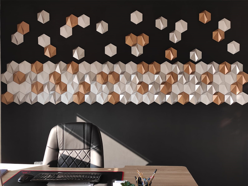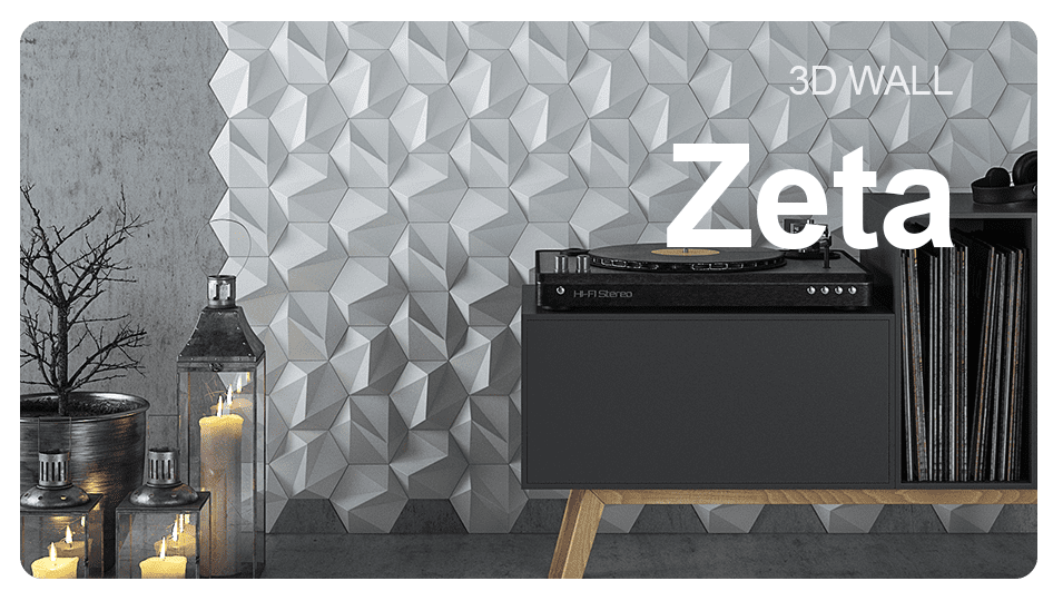 S trojrozmernými šesťuholníkovými dlaždicami je „ZETA“ elegantnou verziou vzoru vo forme včelieho plástu, ktorý je k dispozícii v lesklom aj matnom vyhotovení, ako aj v rôznych farbách. Ich uhlové plochy vytvárajú jemné odtiene a môžu byť usporiadané tak, aby vytvárali subtílne obrazy a grafiku. 3D nástenná dekorácia ZETA vytvára realistický trojrozmerný pohľad vďaka svojim symetrickým ostrým líniám. Tí, ktorí hľadajú moderný romantický nádych vo svojich interiéroch, budú ohromení polygonálnou geometriou ZETA. Vizuálna poézia nenápadných odtieňov pôsobí upokojujúco, keď sa prirodzené svetlo jemne odráža od 3D nástennej dekorácie.