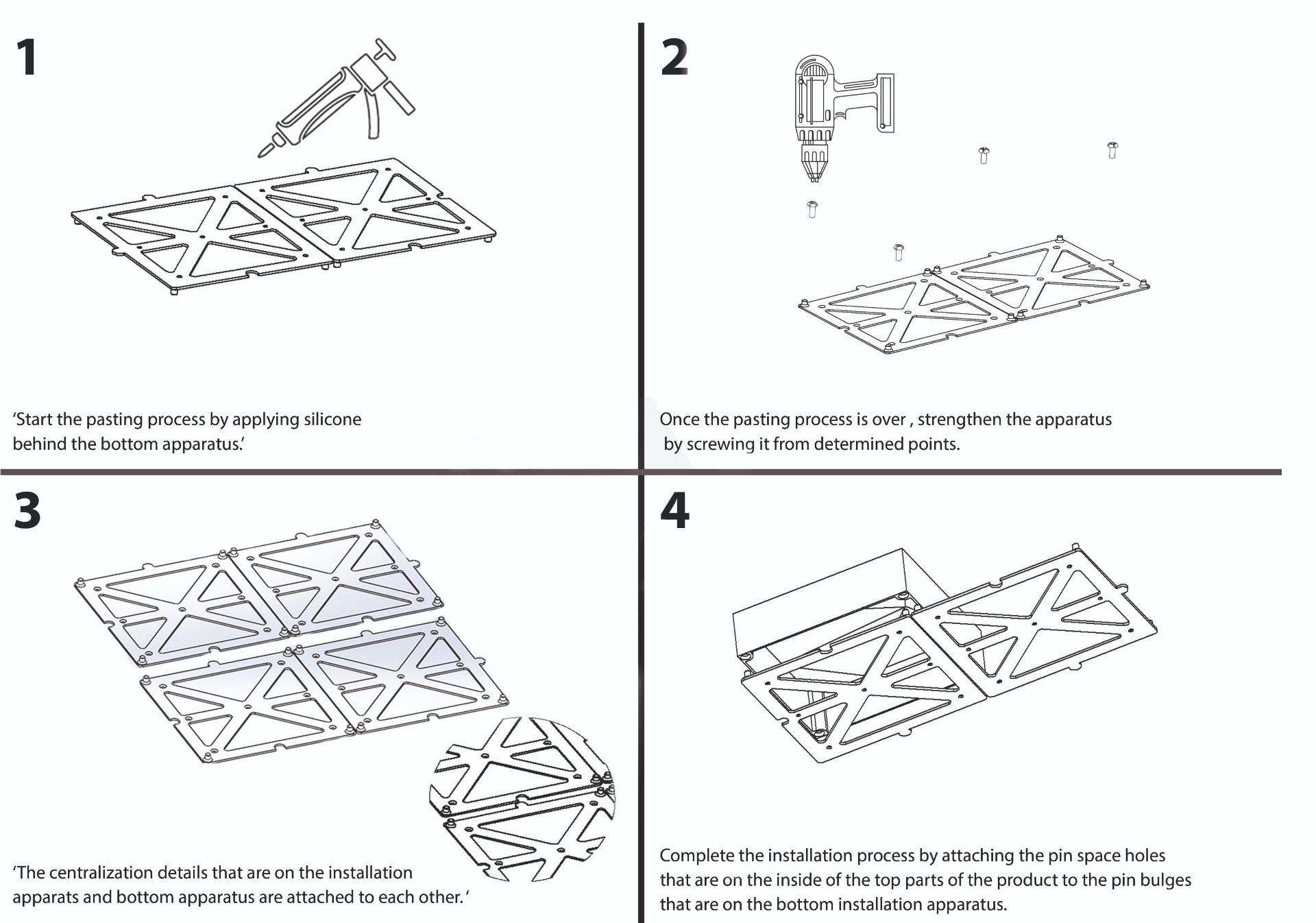 V balení 3D stenových panelov sa nachádzajú modulárne montážne zariadenia a vizuálne časti. Montáž spodného montážneho zariadenia môžete začať od najnižších alebo horných rohov steny. Na prilepenie produktu môžete použiť silikónový tmel. Po dokončení montáže podsystému je potrebné počkať, kým vyschne.