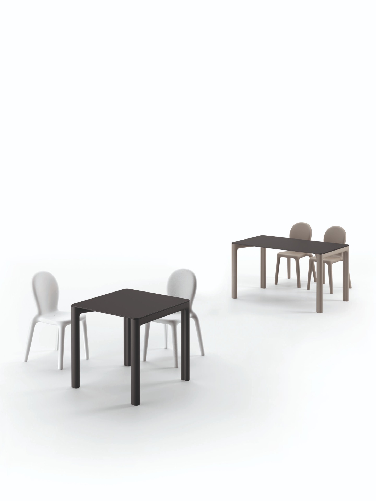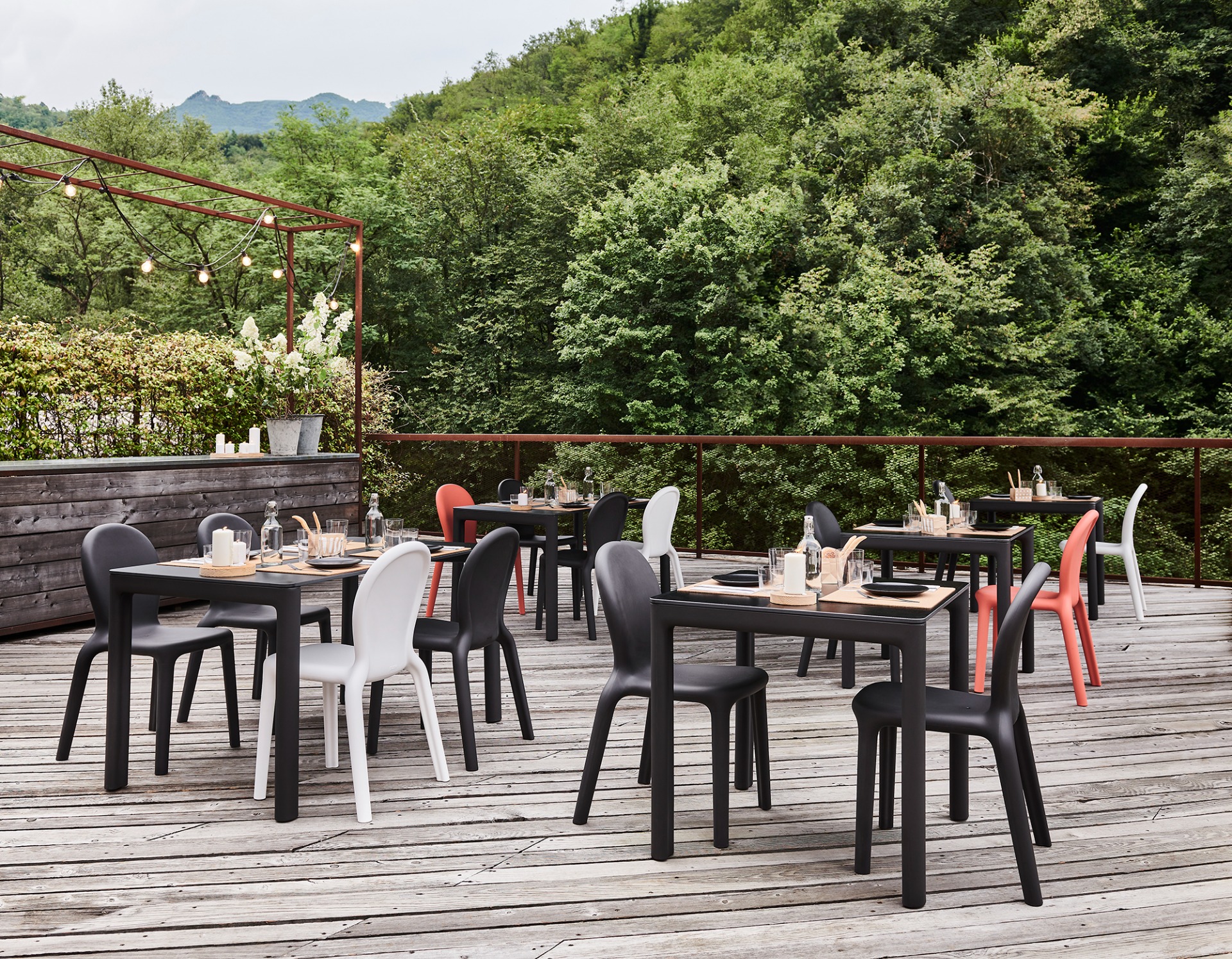 Sada stolov pozostávajúca z nosnej konštrukcie nôh z PE, rotačne formovaného polyetylénu, v kombinácii s čiernymi doskami z HPL, vhodná pre použitie v interiéri aj exteriéri. Moderné a minimalistické línie ich robia obzvlášť univerzálnymi pri zariadovaní súčasných priestorov.